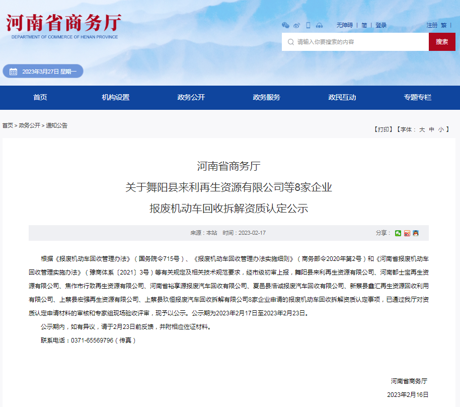 疫情褪去,百业复兴。近日,2023年河南省首批报废机动车回收拆解资质认定公示名单成功通过公示期,恭喜KY在线官网_ky(中国) 合作企业(舞阳来利,河南都市宝,新蔡县汇鑫)成功通过河南省商务厅2023年新标准资质验收!