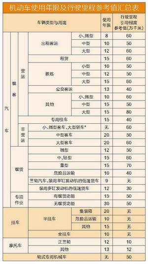 2、对小、微型出租客运汽车(纯电动汽车除外)和摩托车,省、市、自治区、直辖市人民政府有关部门可结合本地实际情况,制定严于表中使用年限的规定,但小、微型出租客运汽车不得低于6年,正三轮摩托车不得低于10年,其他摩托车不得低于11年。