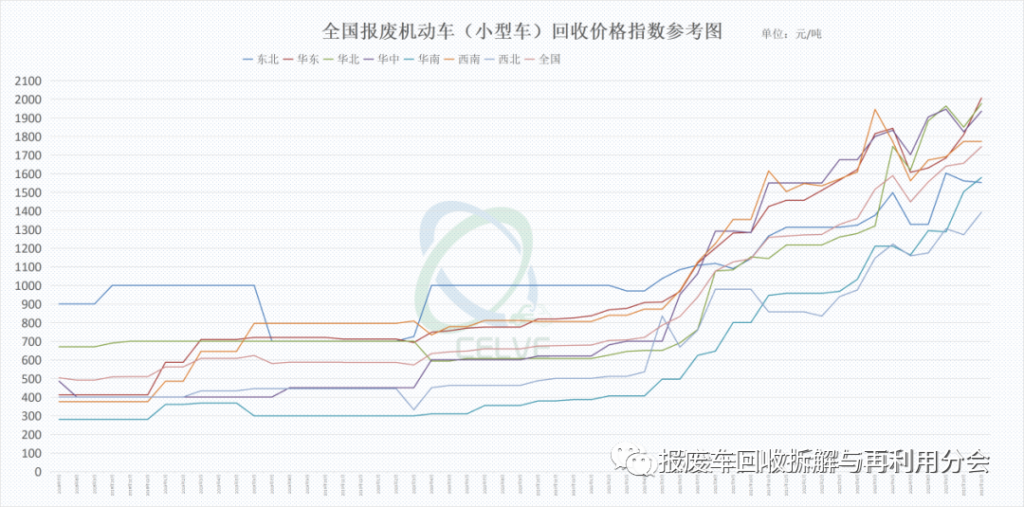 根据中再生协会报废车分会每月整理的全国报废机动车回收价格指数(CELVE- Price Index)统计显示,今年上半年因疫情影响,部分地区少数报废车企业因为封控等因素暂停收车业务,市场竞争的加剧倒逼大部分地区企业上调回收价格,但企业收车情况仍不理想。6-7月份,受下游市场持续下跌的影响,回收价格小幅回调,8月份,价格触底呈现技术性反弹,市场需求方面也面临“金九银十”,原材料市场价格利好,加上经济逐步复苏的因素下,市场观望情绪逐渐消去,成交活跃渐起。至9-10月份,下游市场废旧资源整体呈疲软态势,受此影响,报废机动车回收市场的价格呈低迷走势,部分省市报废汽车回收价格虽有小幅调整,呈走高态势,但市场成交较差。截止到11月底,据CELVE全国报废机动车回收价格指数趋势图显示,大型车、中型车及小型车的回收价格综合指数较之前维稳居多,但是全国回收市场的竞争环境加剧,部分省市的报废车回收价格仍有小幅上涨的态势。相比今年上半年回收价格震荡上扬,年底企业的实际成交价格基本回归理性,大部分企业在对外报价的基础上,参照车况的实际情况进行成交定位,因此从CELVE报废车回收价格指数的走势上来看,今年各区域回收价格总体上涨,期间震荡调整、涨跌互现。